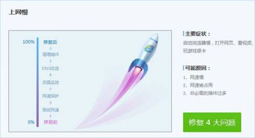 一键修复功能针对常见的启动浏览器慢,打开网页慢,看视频慢,玩游戏卡四大上网慢问题深度修复,此功能最大的优点在于用户可以根据自己的上网习惯个性化设置就可以智能化分配网速,还可以将过多的“不必要插件”进行清理,轻松解决上网慢的问题;下面小编给大家演示下如何轻松提高电脑运行速度。