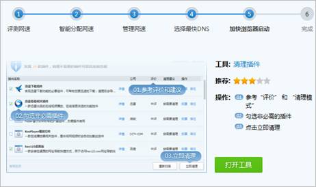 第五步:加快浏览器启动设置;很多网友反馈自己的电脑经常被篡改首页、强推广告窗口等,其实这正是不速之客“插件”在作怪。电脑管家可自动检测电脑上存在的所有插件,会显示插件的名称、简介、出品公司以及网友评分,用户都可以一目了然。用户可以依据评分和建议选择清理插件,将不熟悉的不需要的插件进行清理,对不速之客的“罪行”进行处理。