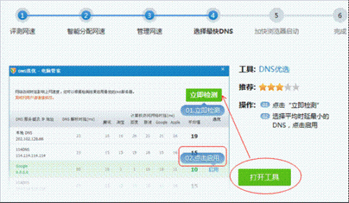 第四步:“DNS”设置,电脑管家会自动检测出最快的DNS,根据检测结果启动平均值最小的DNS。