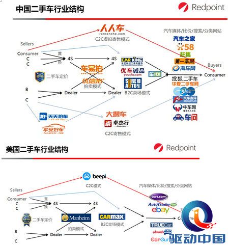 中国二手车行业结构与美国类似,传统流通模式都是C-B-B-C,但又略有差异。相较新车市场定价权很大程度上掌握在整车厂不同,二手车市场的自由化程度极高。这是因为每一台二手车都是非标准品,都需要根据车况进行单独评估定价。