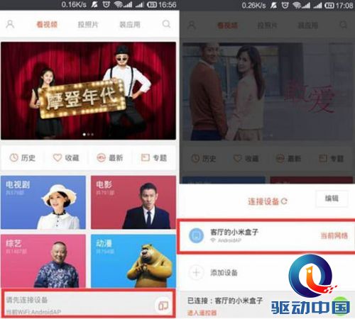 投屏神器一般会自动连接小米设备,不过如果找不到的话这样做:点击屏幕右下角的"连接按钮",选择并连接上需要安装软件的设备,设备名称可以在"小米盒子设置"中"关于"里面找到;注意:小米盒子设备一定要和手机在同一局域网下;