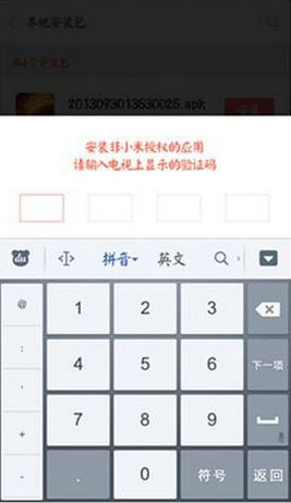 点击安装,会弹出窗口提示“请输入电视上显示的验证码”,电视屏幕上会出现相对应的4位验证码,手机上输入即可