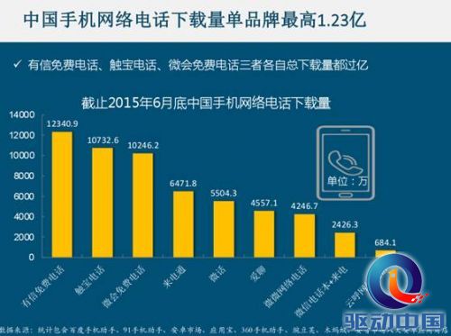 《报告》指出受益于智能手机的普及、国内WIFI大面积覆盖和4G网络的兴起,我国网络电话通信正值千载难逢的“高速发展期”。《报告》与之相对应的数据显示,在国内仅有信一家,其客户端下载量累计就达到单品牌最高的1.23亿,而超过亿级客户端累计下载量的品牌还有触宝电话和微会电话,行业百花齐放。