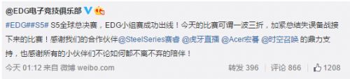 作为EDG的官方合作伙伴,Acer宏碁从一开始就全力支持EDG的S5征服之旅,提供全方位的服务的同时,一直为他们加油助威。付出才有回报,当EDG出线后,第一时间既在其官方微博感谢了自己的赞助商Acer宏碁。