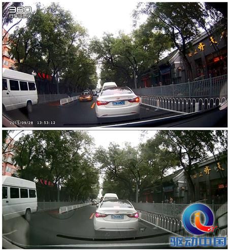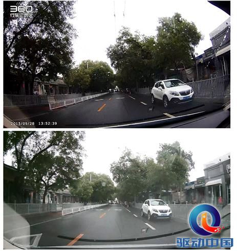都说了,是骡子是马,拉出来溜溜。我们还是进行两款产品的实测吧。在下午时分,我们进行的实拍效果如下。从中可以看到,尽管两者都可以准确看清前车车牌号,但毫无疑问,360行车记录仪的清晰度更加好。