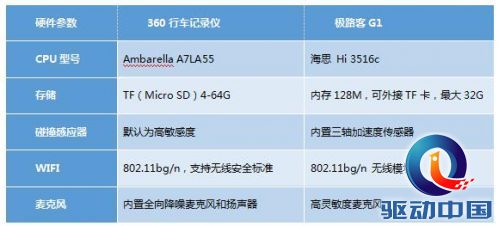 在安霸最新的7系CPU中,360选用的A7LA55定位中端偏高,支持1296P@30fps,极路客G1选用的海思Hi3516C支持1080@25fps。在存储方面,360行车记录仪以TF卡的方式存储,最大支持64G,而极路客G1虽然有内存128M,但支持TF卡容量仅有32G,从中可见,主控芯片还是非常重要的(高端的主板往往支持存储规格更高)。而在其他方面,两者几乎没有本质区别。