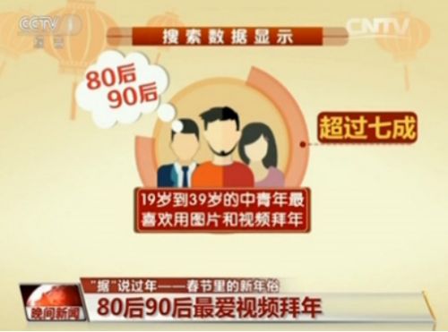 还记得每逢春晚开始,便堵塞不断的短信吗?随着移动互联网的发展,人们主流的拜年形式早已经变成了即时通讯、图片拜年、红包拜年等形式,而如果图片拜年还不过瘾,那么就来一段视频互动吧。大数据搜索显示:猴年春节,19岁到39岁的中青年中,80后和90后已经成为视频拜年的主流。而在过年期间,输入“鬼畜输入法、视频拜年”等相关词语的检索量,较平时激增约700%。其中男性用户占到了61%的比例。可见男性用户更喜欢鬼畜等新奇好玩的拜年形式。