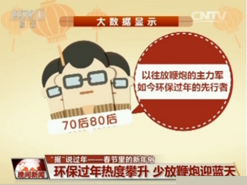 在节目中,央视引用360大数据显示:禁放鞭炮、电子鞭炮、环保过年。其中男性群体搜索量占比82%,30岁到39岁群体占比49%。大数据还显示:过去三年春节期间,烟花爆竹的搜索量并没有显著增长,而且关联度最高的三个词,已经由三年前的“烟花爆竹价格”、“烟花爆竹批发”、“烟花爆竹燃放”,变更为“烟花爆竹安全管理条例”、“禁放烟花爆竹”、“烟花爆竹专营”,人们环保意识提升迅速,享受蓝天成为人们的环保新时尚。
