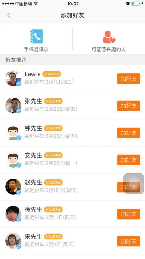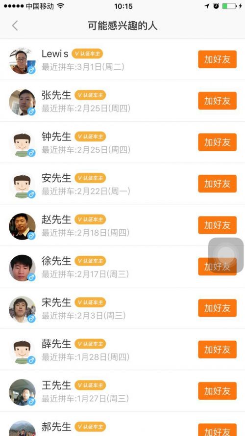 其次,在“好友”这一底导航栏中,会出现一个“可能感兴趣的人“列表,为你匹配曾经一起拼过车的用户。一面之缘,也许可以变成日后久处不厌的朋友。