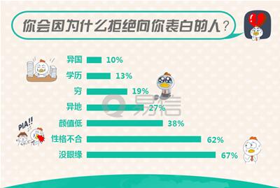 你会因为什么拒绝一个向你表白的人?易信此次调查显示:没眼缘、性格不合适成为表白被拒的两个主要原因,分别占比67%、62%;而部分年轻网友有看脸的倾向,颜值低成为第三大理由,占比38%;其他原因,包括异地、不是土豪、学历、异国紧随其后,占比依次27%、19%、13%、10%,最后还有网友补充的非单身、身高差等原因。