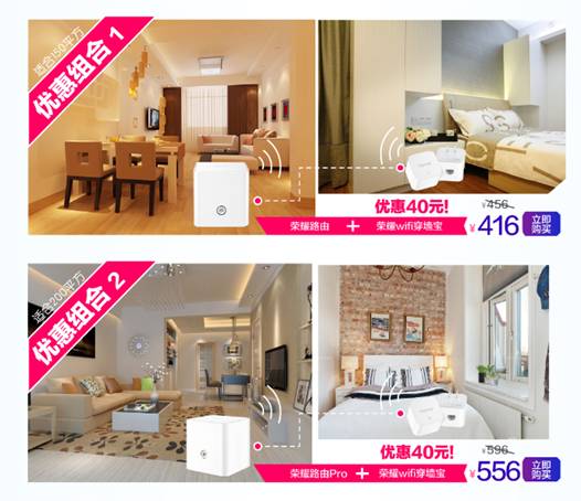 此外,京东、Vmall、天猫旗舰店和平台自营店等还将启动组合套装优惠购的活动。荣耀路由Pro、荣耀路由和荣耀WiFi穿墙宝的优惠组合,能够满足消费者的不通用网需求。只要购买组合套装,就可以享受减免40元的降价优惠。用556元的价格带走荣耀路由Pro+荣耀WiFi穿墙宝两件荣耀WiFi神器,让你的家用网络信号更强、更稳定。