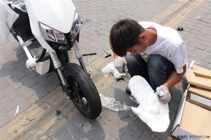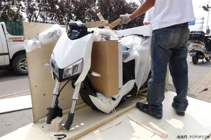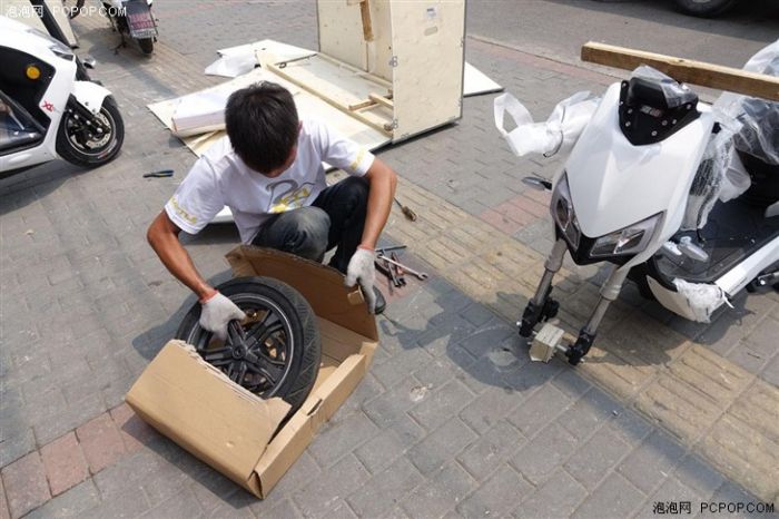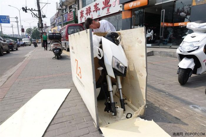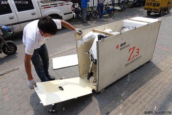 接到电话,我们第一时间奔向了清华东路店,这是北京少有的“电动车”一条街,各式品牌都有专卖店铺,雅迪也在其中之一。刚到门店的时候,环顾四周并没有见到封箱的Z3,在验明身份信息后,两名店内的组装员工将车搬了出来(注意木箱中间有专门预留的提手)。当然,这么详实的身份验证或许也与Z3上市前的封闭测试有关,无论如何,自营的线下实体店对车主的身份审核肯定是高于物流公司的。