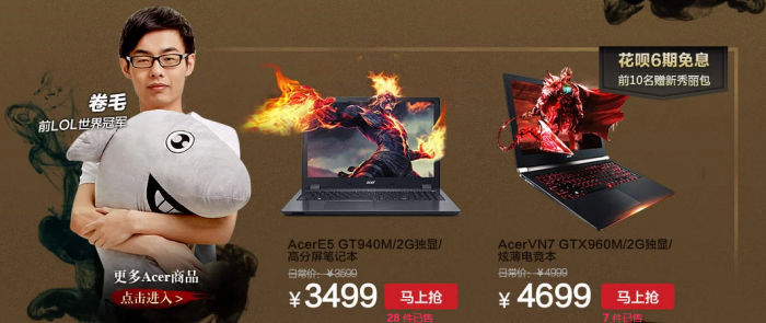 为满足广大粉丝们能够再次一睹毛神风采的机会,直播期间设立拥有召唤能力的购买资金池,凡观看直播的网友通过相关提示购买电竞专属装备Acer宏碁E5和Acer宏碁VN7 等活动指定机型,即可将购买金额进行累计,金额达到相应目标,还可成功将卷毛送去CJ挑战神秘王者战队。凡前100名成功付款的亲们,还可有机会获得Acer宏碁为大家准备的新秀丽背包、暴风魔镜、鼠标等酷炫礼品,并且使用花呗6期免息分期购指定机型,更可享超值优惠。真可谓毛神驾到必有惊喜,小伙伴们快准备好拥抱卷毛和Acer宏碁大礼的姿势吧。
