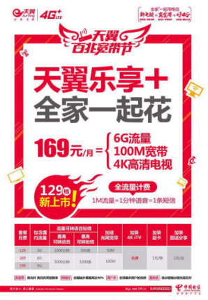 天翼乐享+,全家一起花,新用户购机或老用户自备机促销价可享受最新优惠,热销套餐169元/月(原件299元)全包啦!包括6GB流量、4K高清新电视、100兆光宽带。