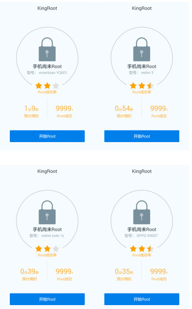 (图:KingRoot 对坚果 U1(YQ601)、红米2、红米note 1s、OPPO Find7适配成功)