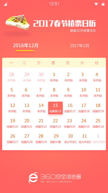360浏览器推出2017春节抢票日历