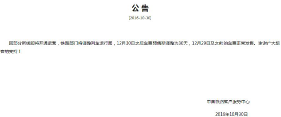 铁道部客户服务中心12306网站上通知写到:“因部分新线即将开通运营,铁路部门将调整列车运行图,12月30日之后车票预售期调整为30天,12月29日及之前的车票正常发售。谢谢广大旅客的支持”。通知中12月30日,12月29日均为车票票面乘车日期。