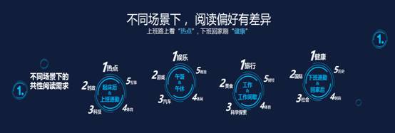 报告显示,在不同场景下用户的阅读偏好也会出现差异。例如,移动端资讯阅读的主要场景中,早上上班时间大多以了解热点、时事类新闻为主,晚上回家后主要是健康、时尚等个人兴趣,其余的碎片时间则是娱乐、获取谈资为主。除了不同场景下的共性阅读需求,军事、科技、旅行等也是不同时间段点击浏览量TOP5的细分频道。