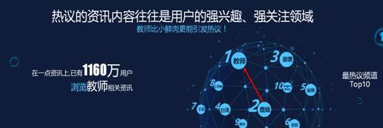 此外,评论是用户表达关注度的一个方式,可以洞察某一类资讯内容的用户态度。目前在一点资讯上,热议频道TOP10第一位居然是“教师”,讨论热度甚至超越了“鹿晗”,已有1160 万用户浏览了教师资讯。可见,教师比小鲜肉更能引发热议。