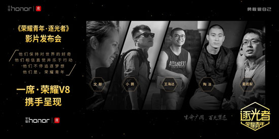 荣耀新青年·逐光者项目由荣耀V8携手一席联合呈现,旨在以纪录影片的方式,描述卓越青年的勇敢行动和荣耀历程,宣扬荣耀品牌勇敢行动,追逐梦想的理念,以此激励更多年轻人勇敢行动,成就自己。5支纪录影片,分别展示了青年壁画艺术家文那、旅行家小鹏、高端冰淇淋Alexander's创始人王海达、VR科技领域创业者戴若犁、舞蹈艺术家陶冶5位卓越青年的荣耀故事。影片制作历时漫长,其中旅行家小鹏的影片,从纪录开始到成片,甚至持续3年时间,其经历的故事形成影片,赢得全场共鸣。