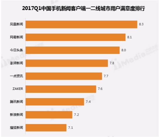 近日,全球领先的移动互联网第三方数据挖掘和整合营销机构iiMedia Research(艾媒咨询)发布《2017Q1中国手机新闻客户端市场研究报告》。该分析报告主要是针对2017年第一季度中国手机新闻客户端市场现状、各平台发展策略进行解读,以及未来发展趋势预测。报告显示,截至2017年第一季度,中国手机新闻客户端市场用户规模达到6.05亿,用户数量增长率放缓。凤凰新闻客户端活跃用户一二线城市占比高于其他平台,且一二线城市用户满意度居行业榜首。