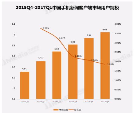 截至2017年第一季度,中国手机新闻客户端市场用户规模达到6.05亿,用户增长率降至1.85%,市场从用户增长红利期转入用户存量阶段。