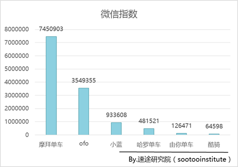 而根据近期速途研究院发布的《2017年第一季度国内共享单车市场调研报告》数据显示,摩拜单车的微信指数为745万,排在首位;第二位是OFO,微信指数不足摩拜的一半,而微信指数呈现出的是移动端网民的关注所在,可以看出,微信生态圈确实拉动了摩拜用户量的增长,双方的再次战略合作成果颇丰。