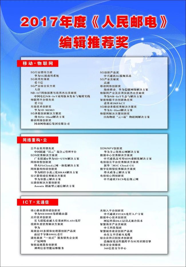 2017年5G、云服务、光宽带、蜂窝物联网、网络新智能、开源、边缘计算等新技术加速发展并逐渐普及,从某种意义上说,这将成为行业发展的新起点。适逢年末,《人民邮电》报聚集运营商、专家及资深编采队伍的智力资源,面向行业推出2017年度《人民邮电》编辑推荐奖——“ICT创新奖”。涵盖“移动·物联网”“网络重构·云”“ICT·光通信”三大行业热门领域,经过初评、澄清材料和总评三个阶段,最终确定36个奖项的获奖名单。