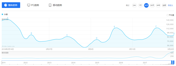 百度指数显示,过去30天里抖音在2月18日之后出现下滑,到3月5日已经跌倒最低,在随后的两个星期六又有波峰出现,但热度已经比春节期间下降了近一半。同样,在微信指数里,经过春节期间的高峰之后,最近抖音的指数已经出现大幅下滑。