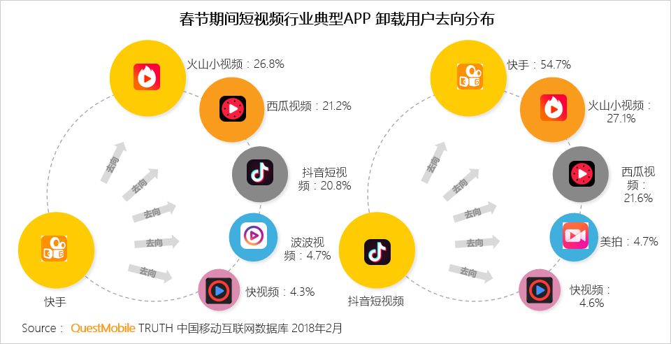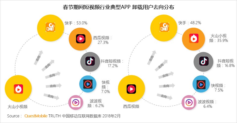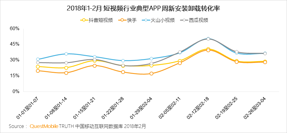 抖音的春节PR几乎都落在了增长的3000万DAU上。同样是QuestMobile的数据,春节期间,头条系三大产品的卸载率明显高于快手。这也充分印证了坊间“今日头条只看增长,不关注用户后续行为”的说法。