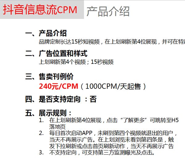 对于头条系产品而言,还有一个绕不过去的话题就是商业化。本周我在头条一个代理商的手里接过一份抖音对外合作刊例,里面列出了截至3月31日抖音对外合作的一些位置和价格。我仔细看了下除了开屏广告以外,信息流CPM已经是抖音最贵的一条营收渠道了。