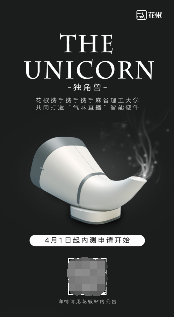 花椒将这套气味远程传播方案包含的唯一特殊硬件设备命名为“独角兽”,并称,自4月1日起接受站内主播的内测申请,通过申请的主播将获得用于气味直播的智能硬件“独角兽”,且名额有限,先到先得!
