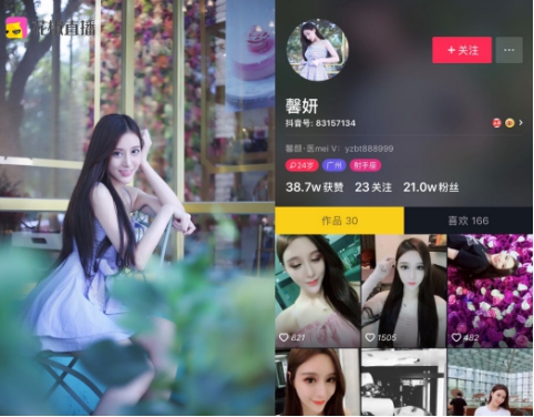 另一位原抖音红人“雨桐”(花椒ID:126698330)也曾拥有21万粉丝,入驻花椒后,她凭借从小学习舞蹈培养出的气质与天生的高颜值,在巅峰之战倾城之争晋级赛中获得第三名的好成绩,累计收到的打赏超过1100万花椒币。