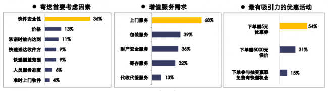调研结果表明:在寄送首要考虑因素中,安全排在首位,其关注度高达36%,价格与时效性次之,占比依次为13%、11%;而在增值服务需求上,上门服务成为学生最关切的要点,出于时间与搬运问题的考虑,近七成的学生更在意快递能否提供上门服务。