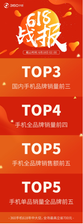 在消费者高涨的抢购热潮中,京东618狂欢节终于杀到。据来自京东实时战报表明,截止凌晨2时许,在竞争最为惨烈的手机领域,当日销量排名前四的四大国内手机品牌依次为荣耀、小米、360手机和华为,360手机首次超越华为,跻身前三行列。而在用户更为关心的单品销量榜上,360手机N6排名前五,次于荣耀畅玩7A、小米8、小米8SE和荣耀畅玩7X。