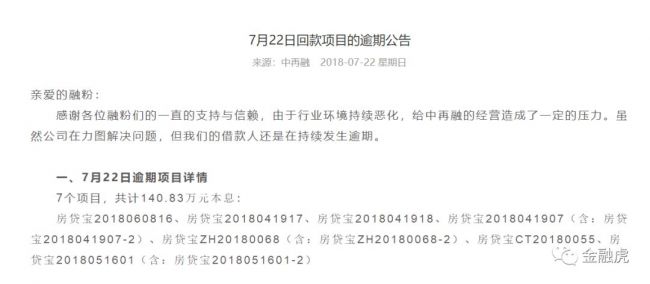 7月21日,中再融房贷宝共计275万本金发生逾期,此次逾期共14个项目,共计275万。7月22日,中再融7个项目逾期,共计140.83万元本息。7月23日,中再融8个项目逾期,共计161.06万元本息。