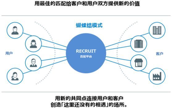 所有商业模式的核心,是以客户为出发点,用一整套的服务与解决方案来满足客户的最终需求,提升客户价值,利益相关方都得到共赢,并且需要与时俱进,持续创造价值。从商业模式看,Recruit是B2B2C的蝴蝶结模型,连接用户和企业,通过匹配,为客户和用户双方提供新的价值。这种模式,既是一种双边模式,也是一种生态思维。