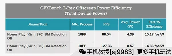 可以发现,监测机制开启后,手机里的麒麟970的帧率达到127.36FPS,几乎是关闭情况下的2倍!功率也达到8.57W,也几乎是2倍……而在UL Benchmark采用公共版本和内部不带识别特征版本的3DMark测试数据对比中,前后的数据竟然可以相差47%!