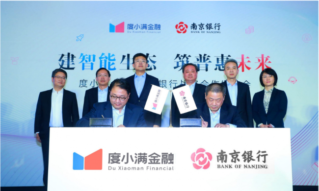 10月26日,度小满金融与南京银行在北京签署战略合作协议,双方将联合推动金融科技创新,在普惠金融、消费金融、小微金融等九大领域展开深度合作,并将合作成果推向南京银行“鑫合金融家俱乐部”的100多家商业银行成员单位。南京银行同时表示将为度小满金融授信100亿元,用于企业发展。度小满金融CEO朱光和南京银行董事长胡昇荣亲自出席活动并致辞,表明这一战略合作有很高规格。