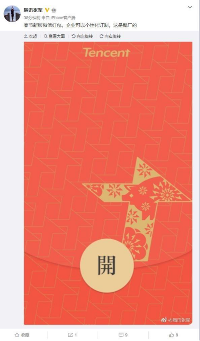 1月21日,微信派发文称“今天起,企业员工可以通过企业微信通知和二维码领取公司定制的微信红包封面;同时,出境游客在境外使用微信支付消费,也有机会获得带有当地特色的红包封面。”
