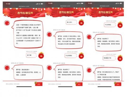 而在春节假期,小i机器人通过Bot开放平台打造了一款名叫“春节尬聊宝典”的智能聊天机器人。其利用大数据以及人工智能的核心技术与资源,针对春节期间大家容易被问及的尬聊问题给出了建议回答。答案分为霸气互怼和稳健和平两种截然不同的回答方式,这也侧面说明了现在很多年轻人心里的实际抵触情绪。