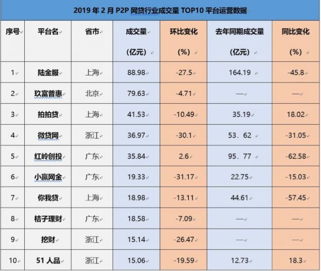 与去年同期相比,这10家平台除51人品(18.3%)和拍拍贷(18.02%)呈增长趋势外。红岭创投、你我贷、陆金服、微贷网、小赢网金均降幅明显,同比变化分别为-62.58%、-57.45%、-45.8%、-31.05%、-15.03%。