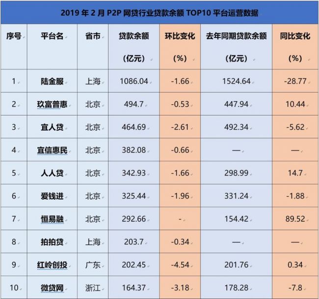 行业规模萎缩趋势明显。具体到平台,结果又是如何?笔者以网贷之家公布的2月网贷行业贷款余额TOP100平台数据的前十家进行参考,结合各平台去年同期公布的贷款余额数据,统计信息如下:
