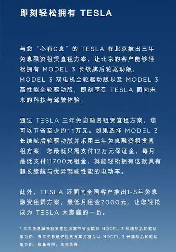 继预售后,6月4日,特斯拉官方微博公告称,特斯拉再次推出融资租赁方案,为北京客户推出三年免息融资购车与免费车牌租赁服务。