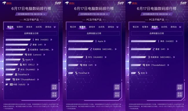 今日的PC及电脑平板产品品牌销量当日榜中,神舟夺下笔记本、游戏本双榜首位。而昨日表现十分亮眼的戴尔则呈现出“逆水行舟,不进则退”的竞争态势,三榜均处于5名开外,令人意料不到。Apple则夺回了轻薄本榜单首席;惠普分居笔记 本、游戏本双榜次席和轻薄本榜单第4位,冲击冠军的机会极大。