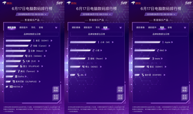 影音娱乐品牌销售额当日榜依旧保持多日来的稳定局面,索尼、佳能、尼康占据榜单前三。适马异军突起,占据榜单第4。今日的耳机榜单仍是Apple的优胜局面。而音箱榜单中,小米、小度热度不减,继续称雄。