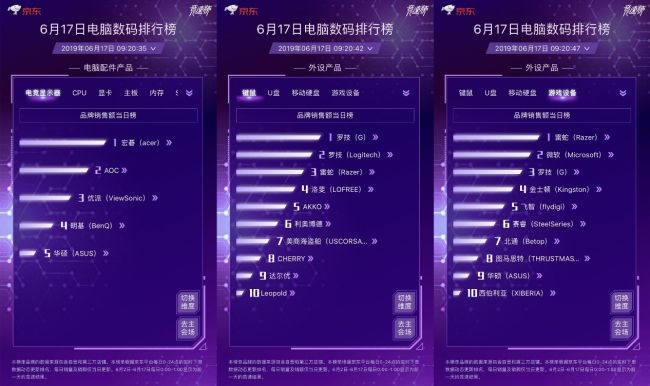 电脑配件产品品牌销售额当日榜,则是“你歌罢后,我来唱”的局面。今日,宏碁力克AOC夺下榜单首席。而优派却成为了榜单中的“少数派”,凭借自身实力、京东优势加持等因素,一路高歌猛进,闯入榜单前三位。键鼠品类榜单中,头部排位变动不大,榜单第四至六位分别为洛斐、AKKO、利奥博德,均为榜单少见的上榜新秀,对现有榜单格局形成较大冲击。游戏设备榜单中,微软实力尽显,击败飞智,夺回榜单次席席位,“姜还是老的辣”!