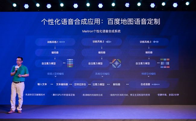 “韵律迁移”通俗的说就是一个人的声音可以讲出不同风格的文本,比如一个人说话时的音调、音节、停顿等,目的是让合成语音正确表达语义,听起来更加自然。倘若缺少韵律前移模型,无法无法精确控制语音的发声,语音的表现力和自然地也就无从谈起。百度地图的“语音定制功能”之所以可以实现个性化的语音合成,与“韵律迁移”方面的方面的深厚积累无不关系。
