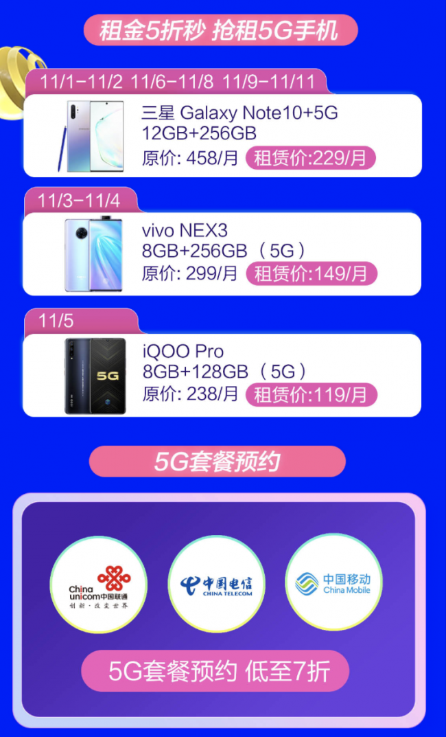 作为国内线上手机销售市场份额第一电商平台,京东并不仅仅满足于集齐全球所有5G手机的首发权,在8月16日金机机颁奖典礼上,京东手机与各大手机厂商、三大运营商一起成立京东5G生态联盟,并推出六大5G手机专属服务,包括零元信用购机、以旧换新补贴、30天无忧试用、京东5G体验官、积分膨胀得5G E卡、京东5G套餐办理,以解决消费者问题为基本出发点,同各方一起努力构建更加完善的5G生活场景,为京东5G用户构造一站式无忧服务体系。据了解,11.11期间,在京东上预约5G套餐的用户,还可享受最低7折的优惠,足以预见,这个京东11.11将成为5G真正爆发的第一站。