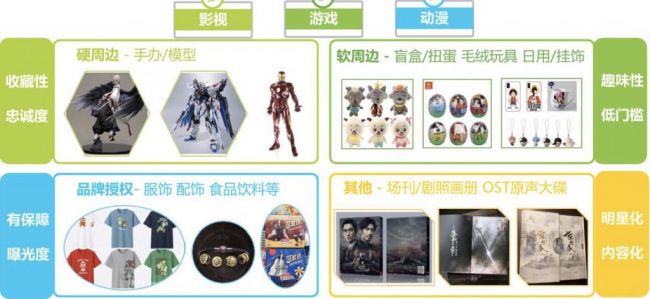 在商品授权领域,目前国内IP大部分以影视、游戏、动漫三类为主,而这三类也是相辅相成的存在。影视类受众基础广泛,其中古装玄幻类国风、历史等传统文化元素较为丰富,便于软周边提取相关元素用于产品开发。例如《西游记》这个大IP,不仅可以拍成连续剧、电影、动画,甚至可以开发到网络手游上,直接带动粉丝经济;游戏类中,用户付费习惯已经养成,具有高粘性。衍生品与虚拟道具捆绑销售可达到1+1>2的效果,像是《生化危机》这个IP,就是改编自日本CAPCOM公司推出的电子系列游戏;动漫中,形象与衍生品开发要素关联度最高,高品质手办较易对二次元粉丝形成“不可抗力”的吸引,《魔兽世界》作为一个典型的IP案例,线上拥有长篇小说、单机游戏、网络游戏、纸牌游戏和动画电影,线下则有着专业的周边手办渠道。